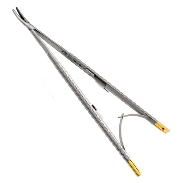 The curved tip of “Pivot-Curved” lock of micro needle holders and micro scissors prevent the suture from getting caught and breaking in the instrument. The drilled pivot stabilizes the working tips and the round handle eases the rotatory motion in the hand.