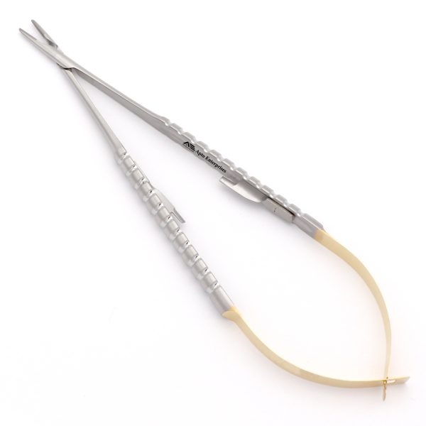 The curved tip of “Pivot-Curved” lock of micro needle holders and micro scissors prevent the suture from getting caught and breaking in the instrument. The drilled pivot stabilizes the working tips and the round handle eases the rotatory motion in the hand.