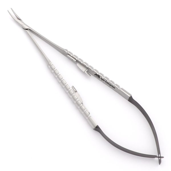 Microsurgical Velvart Curved, Diamonde Dusted Needle Holders are for very fine sutures. Special lock design prevents tangling of the seam. This allows the needle to be guided through coarse gingival tissue with controlled grip pressure.